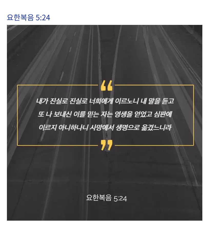 '내가 진실로 진실로 너희에게 이르노니 내 말을 듣고 또 나 보내신 이를 믿는 자는 영생을 얻었고 심판에 이르지 아니하나니 사망에서 생명으로 옮겼느니라 '