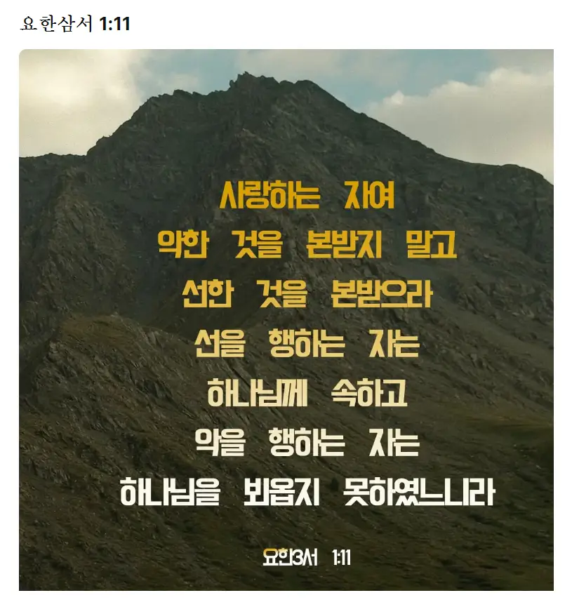 '사랑하는 자여 악한 것을 본받지 말고 선한 것을 본받으라 선을 행하는 자는 하나님께 속하고 악을 행하는 자는 하나님을 뵈옵지 못하였느니라 '
