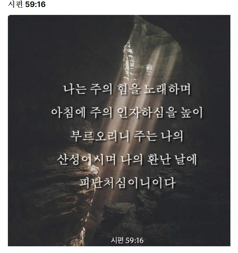 '나는 주의 힘을 노래하며 아침에 주의 인자하심을 높이 부르오리니 주는 나의 산성이시며 나의 환난 날에 피난처심이니이다 '