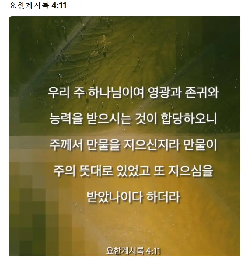 '우리 주 하나님이여 영광과 존귀와 능력을 받으시는 것이 합당하오니 주께서 만물을 지으신지라 만물이 주의 뜻대로 있었고 또 지으심을 받았나이다 하더라'