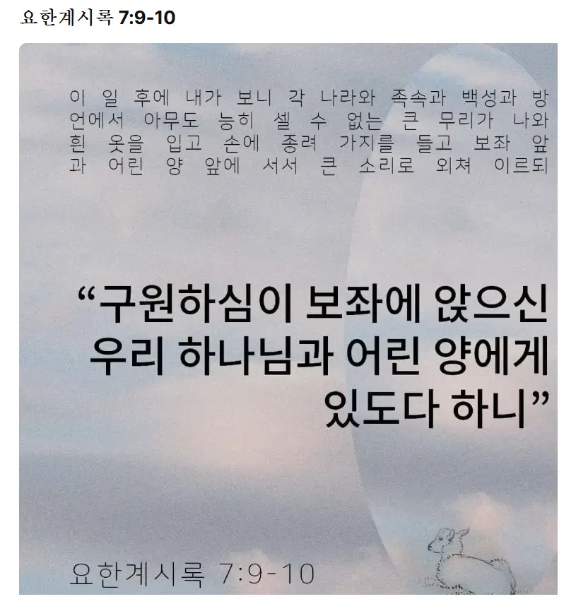 '이 일 후에 내가 보니 각 나라와 족속과 백성과 방언에서 아무라도 능히 셀 수 없는 큰 무리가 흰 옷을 입고 손에 종려 가지를 들고 보좌 앞과 어린 양 앞에 서서 큰 소리로 외쳐 가로되 구원하심이 보좌에 앉으신 우리 하나님과 어린 양에게 있도다 하니 '