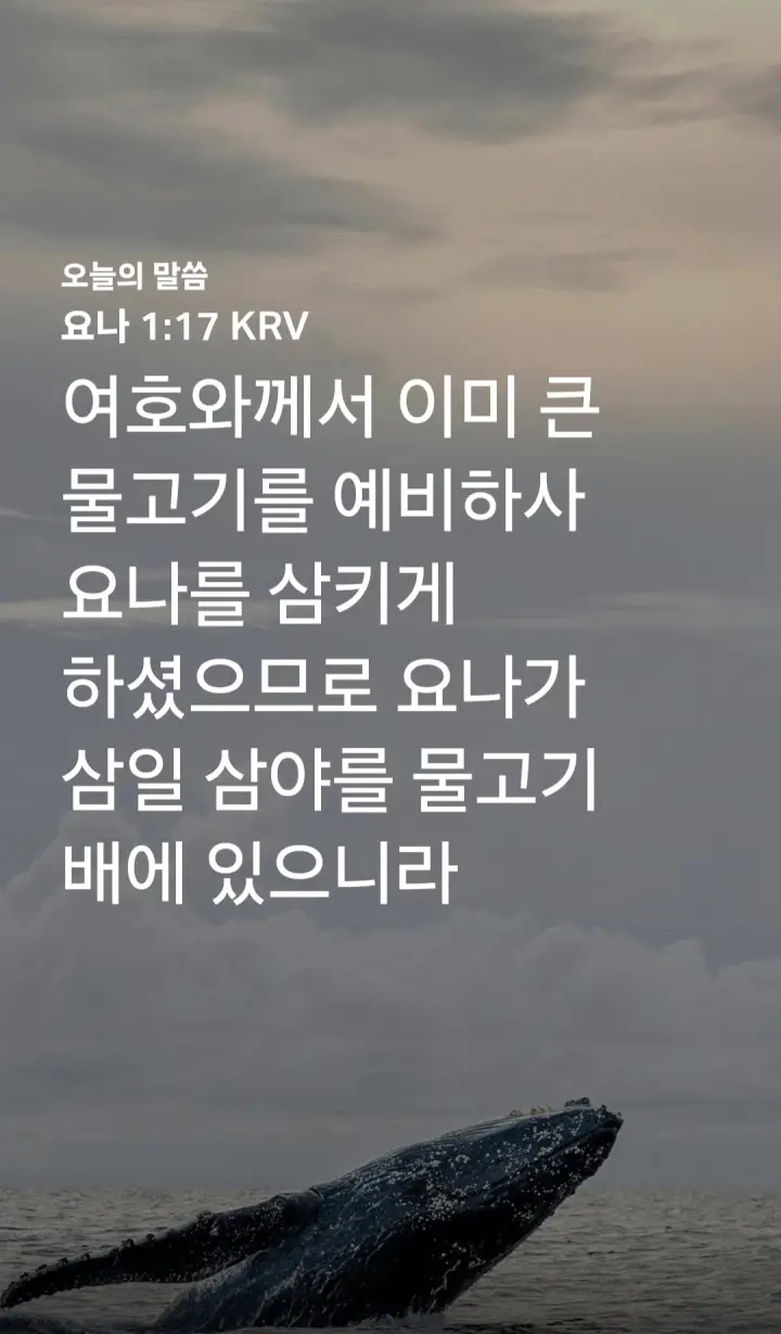 '여호와께서 이미 큰 물고기를 예비하사 요나를 삼키게 하셨으므로 요나가 삼일 삼야를 물고기 배에 있으니라'