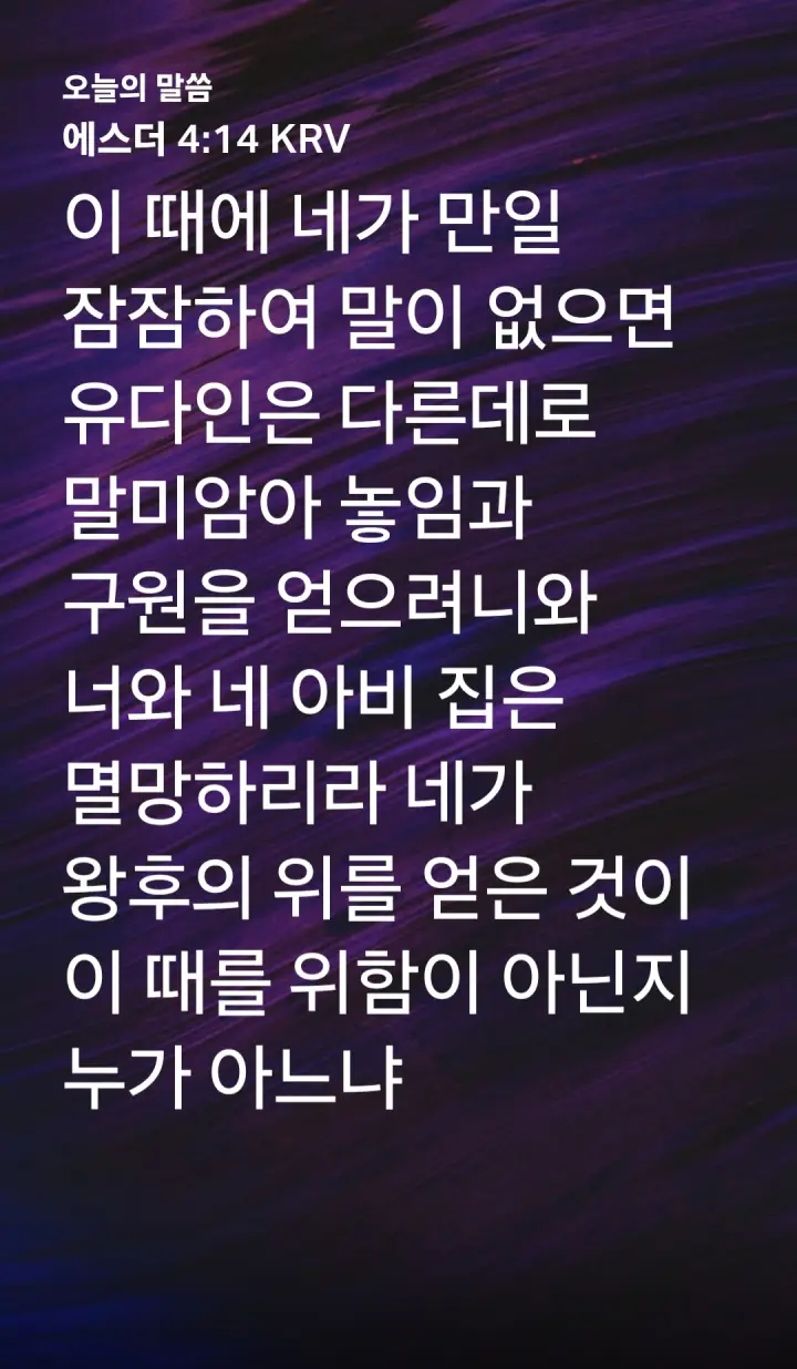 '이 때에 네가 만일 잠잠하여 말이 없으면 유다인은 다른데로 말미암아 놓임과 구원을 얻으려니와 너와 네 아비 집은 멸망하리라 네가 왕후의 위를 얻은 것이 이 때를 위함이 아닌지 누가 아느냐 '