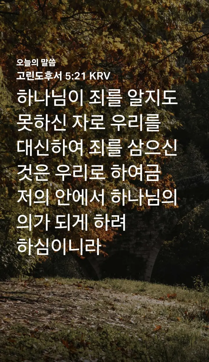 '하나님이 죄를 알지도 못하신 자로 우리를 대신하여 죄를 삼으신 것은 우리로 하여금 저의 안에서 하나님의 의가 되게 하려 하심이니라'