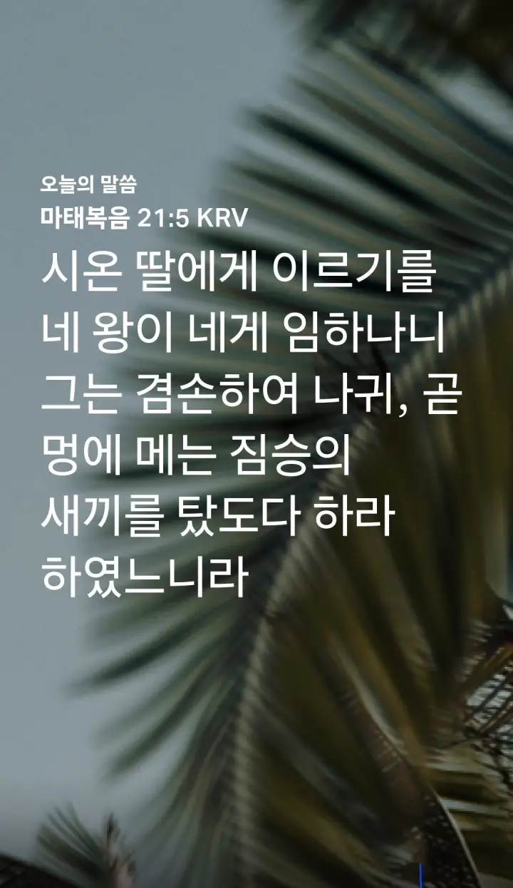 '시온 딸에게 이르기를 네 왕이 네게 임하나니 그는 겸손하여 나귀, 곧 멍에 메는 짐승의 새끼를 탔도다 하라 하였느니라 '